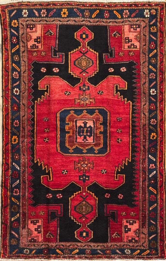 Χειροποίητο χαλί, περσικό, νομαδικό, μάλλινο, από την περιοχή Hamadan, με πολύ ζεστά σκούρα χρώματα. Γεωμετρικά σχέδια επάνω σε ροδί φόντο και ροδί γωνίες. Παχύ πέλος με αραιή πλέξη.