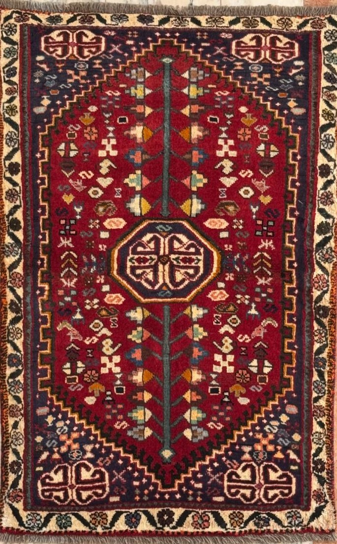 Χαλί χειροποίητο, περσικό, νομαδικό, ολόμαλλο, από την περιοχή Shiraz και τον ευρύτερο νομό Gasgai, με κεντρικό ρόμβο, σε πολύ ζεστά χρώματα σε κόκκινο κεραμιδί και μπέζ μπορντούρα. Αρκετά παχύ πέλος με μεσαία πυκνότητα κόμπων. Ιδανικό για ξύλινα πατώματα και χειμερινούς προορισμούς!