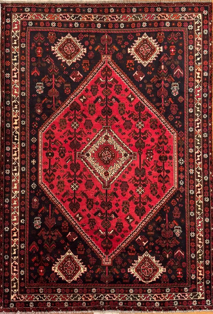Χαλί χειροποίητο, περσικό, νομαδικό, ολόμαλλο, από την περιοχή Shiraz και τον ευρύτερο νομό Gasgai, με κεντρικό ρόμβο, σε πολύ ζεστά χρώματα σε κόκκινο κεραμιδί και καφέ – μαύρη μπορντούρα. Αρκετά παχύ πέλος με μεσαία πυκνότητα κόμπων. Ιδανικό για ξύλινα πατώματα και χειμερινούς προορισμούς!